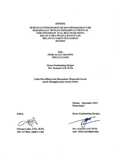 Negosiasi, serta hubungan pemahaman isi dan pemahaman ciri kebahasaan dengan kemampuan menulis teks negosiasi oleh siswa kelas.