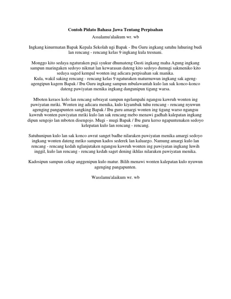 Contoh teks pidato kepala sekolah bhs jawa borngranobyn31 s soup. Matur nuwun bapak/ ibu guru, anggenipun nggulawentah dhumateng kula . Contoh pidato perpisahan kelas 6 bahasa inggris singkat dan artinya pidatowebid merupakan blog kumpulan berbagai contoh teks naskah pidato sambutan atau ceramah . Kula, wakil saking siswa kelas ix, ngaturaken agunging panuwun dhumateng bapak ibu guru. Kula minangka wakil saking siswa kelas vi, ngaturakeun agungin panuwun ingkang tanpa upami dhumateng bapak ibu guru, awit saking sih katresan .